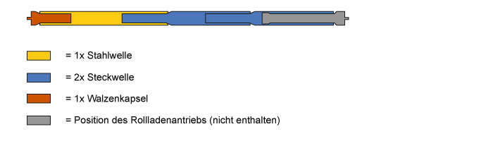 Die Wellensets gibt es in 4 Längen für Rollladenkästen bis maximal 295 cm. Durch das Stecksystem reduziert sich die Paketgröße auf eine handliche Länge von maximal 110 cm. Somit wird ein kostengünstiger Versand ohne Überlängenzuschlag des Pakets ermöglicht. |