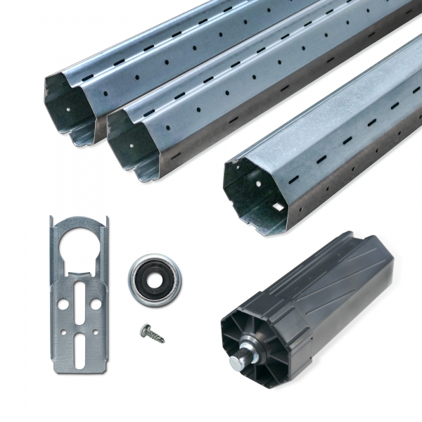 Das Komplettset für Neubaukästen bis 295 cm beinhaltet die Achtkant Rollladenwelle (1x Stahlwelle, 2x Steckwelle) mit einer Schlüsselweite von 60 mm, eine Lagerhalterung für Neubaukästen, ein 40/12 Kugellager, eine Walzenkapsel mit 12mm Achsstift sowie eine Selbstschneideschraube. Für Zwischengrößen kann die Welle mittels einer kleinen Metallsäge* einfach und leicht eingekürzt werden.